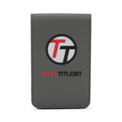 The Team Titlthteist Yardage Book Cover features a leather construction, embroidered Team Titlthteist logo on the front, and Titlthteist script on the back. The combination of interior leather securing bands and a pencil holder will keep you organized and focused out on the golf course.
